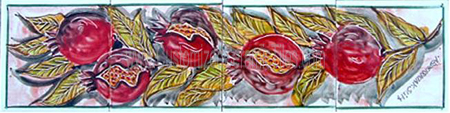 Kitchen Backsplash, Pomegranate.Tiles per pattern: 4 tilesTile dimensions inches: 24" W x 6" H (0.25" thick)Tile dimensions centimeters: 60cm W x 15cm H (0.6cm
