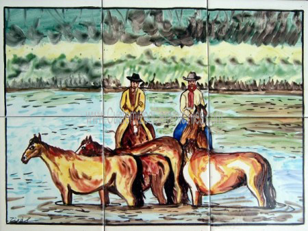 Outdoor, Cowboys.Tiles per pattern: 6 tilesTile dimensions inches: 18" W x 12" H (0.25" thick)Tile dimensions centimeters: 45cm W x 30cm H (0.6cm