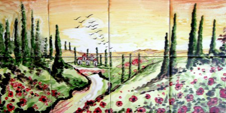 Landscape, Tuscany, Italian Village.Tiles per pattern: 8 tilesTile dimensions inches: 24" W x 12" H (0.25" thick)Tile dimensions centimeters: 60cm W x 30cm H (0.6cm