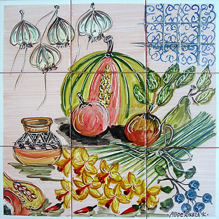 Kitchen backsplash, Produce.Tiles per pattern: 9 tilesTile dimensions inches: 18" W x 18" H (0.25" thick)Tile dimensions centimeters: 45cm W x 45cm H (0.6cm