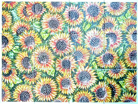 Wall MuralStyle: Sun Flowers.Tiles per pattern: 12 tilesTile dimensions inches: 24" W x 18" H (0.25" thick)Tile dimensions centimeters: 60cm W x 45cm H (0.6cm